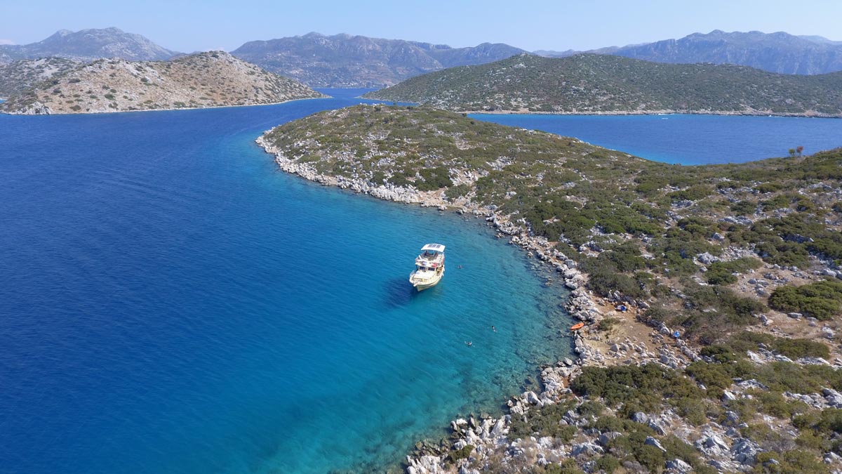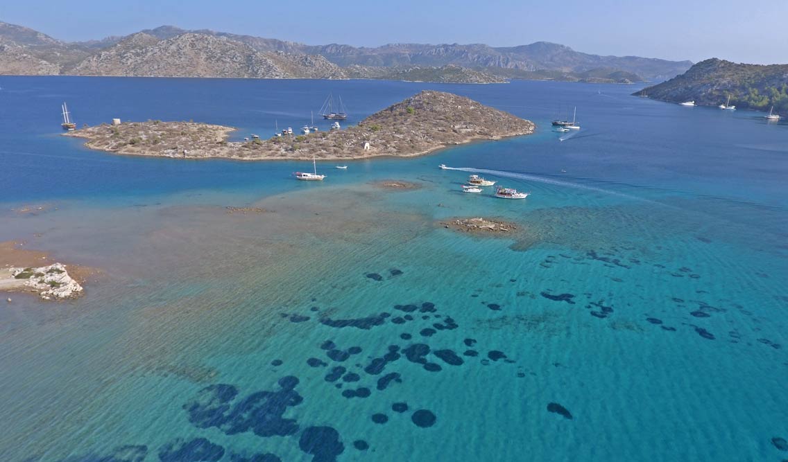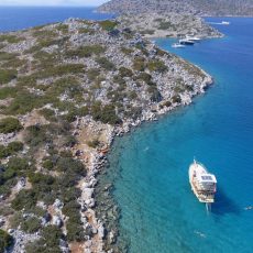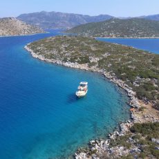 Today we are heading further east in the Gulf of Hisaronu until we reach the Apostoli cape. This is an area where divers go to enjoy the underwater world. We do a 3+ km swim from the cape to Ayaca bay where we stop for lunch. Delicious Turkish mezes, salads and other delicious locally produced food is served on the boat. After lunch, we take some time to digest our food and relax on the top deck of our gulet. Afternoon 2.5 km swim takes us from Tavsali island to Ada Bogazi, a local historical ruin. We stop at the ruin to have a look around and touch the history of this area.