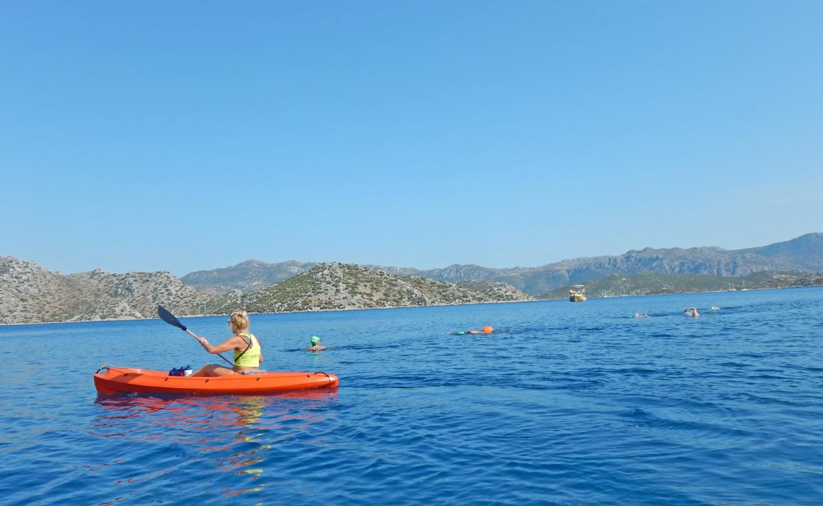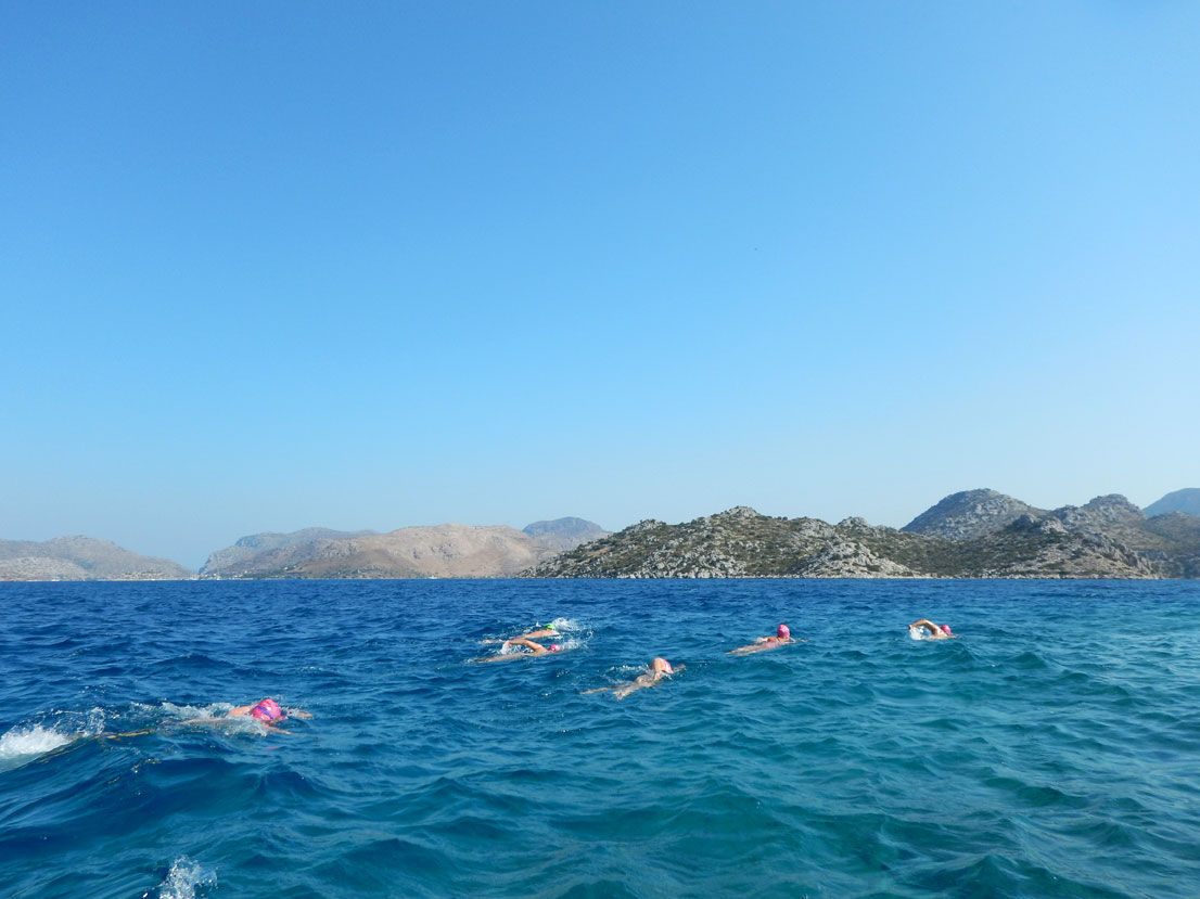 Today is a real island-hopping swimming experience. From Bozburun we set off to Taslica island where we swim to Suluca island and connect over to Degirmenli island. A total of around 2.5 km swim. This is a great opportunity to experience island-to-island swimming with a group of swimmers and practice your sighting skills. We follow you with our escort boats and a kayak. Lunch on the Degirmenli island and time to relax or play water polo in the bay. Should you want to ask any further questions about your swimming technique, this is the time to do that and our guides will be happy to help you out.