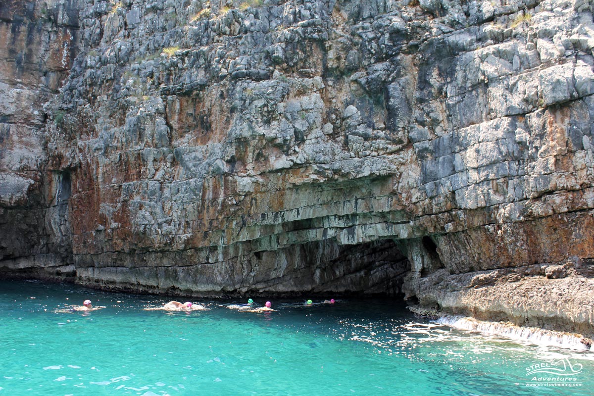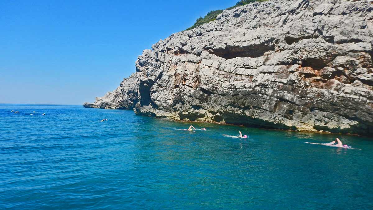 Today we head out to the Blue Cave on the Adriatic, locally know as Plava Spilja (Blue Grotto). We pass the Mamula island, Azra fortress and start our first swim around the Blue cave area. Sea colours around the caves offer us an incredible start for our swim. We follow the high cliffs along the coast, swim in and out of several small coves until we reach the Veslo bay. Swimming in the crystal clear water of the Adriatic is a great experience!