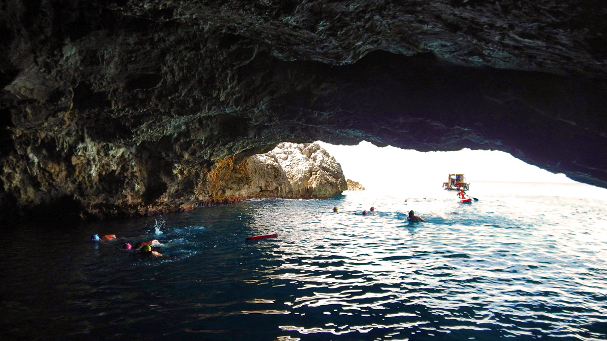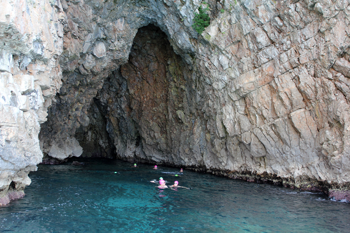 The afternoon swim is between two incredible Yugoslav submarine tunnels along the Lustica peninsula. We stop in the tunnel where you can see how the Yugoslavian Navy used to store and hide their submarines. All tunnels are dead ends, so you cannot swim through, but you can swim to the end and back.