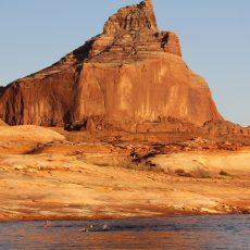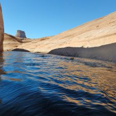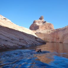 Following our morning breakfast, we will gather all our swimming gear and head out for our first day on the lake. After 15-minute drive we will stop at the marina (a daily routine) where we are going to board our powerboats. From there we will head towards North-East to Utah´s Lake territory until we reach Labyrinth Canyon. The Canyon itself takes us to Arizona territory. Passing by on the east side is dominating Padres Point. Straight ahead is a great view of Tower Butte, famous Glen Canyon landmark noted for its nearly identical symmetry on all four sides. It rises 800 feet from Wild Horse Mesa, its flat top 5,282 feet above sea level. We will swim 1 mile – 1.5 miles out of the canyon towards Dominguez Butte. We are going to swim in the canyon between the Boundary Butte and Tower Butte. Our escort boats will pick us up and we will travel to a peaceful spot inside the canyon for lunch.