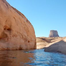 The early afternoon will be devoted to a short hike between Boundary Butte and Dominguez Butte. You will see some amazing high rock formations and narrow parts formed by the power of natural water. After our hike, we are going back in the water to swim our next mile and a half straight south into the Face Canyon. We are going to swim by serrated sandstone formations of unusual shapes and colors. When we are finished with swimming, our powerboats will take us back to the marina and to our hotel transportation. Dinner in Page.