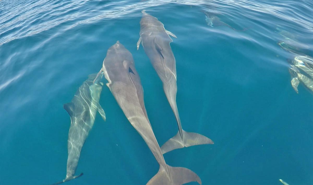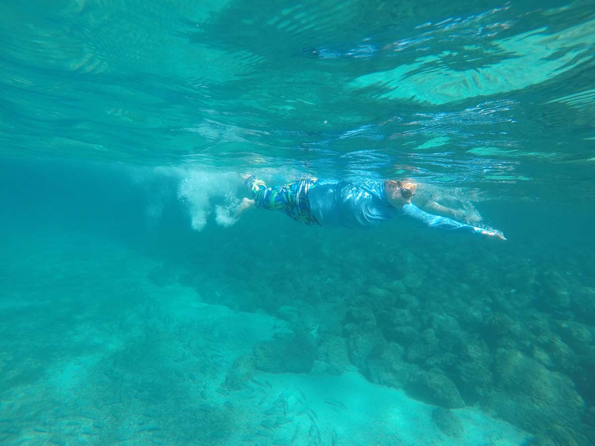 Second swim in the Los Metales bay on the eastern side of the island. The waters here are shallow and we enjoy looking at thousands of fish underneath. We also hope to see a bunch of dolphins around us.